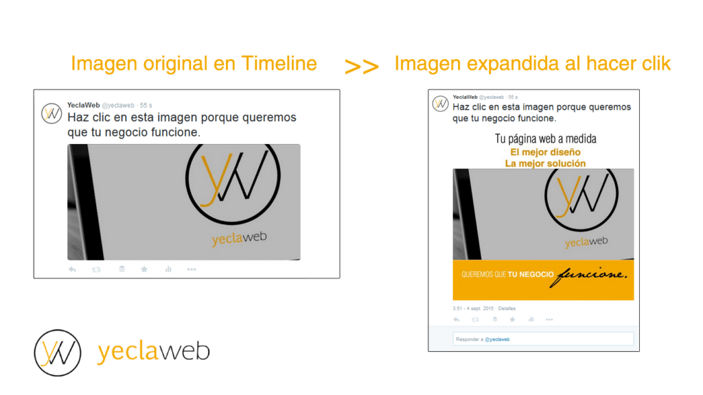 Si escribes un tuit con una imagen, debes saber que las imágenes se muestran con un tamaño en la página principal o Timeline y se muestran con otro tamaño y otra proporción alguien pincha en la imagen que estas tuiteando. Si quieres que tus imágenes sean más visuales, debes hacer que la parte principal de la imagen esté en el centro de la imagen ya que Twitter la corta a no ser que pinches en la imagen. En la página principal de Twitter en la que se muestran todos los tuits aparece una imagen de 506×223 píxeles pero al expandir el tuit pinchando la imagen, la imagen puede crecer en altura mostrando otro tipo de contenidos. En cualquier caso, un tamaño óptimo para la imagen de un tuit es 880×440 píxeles.